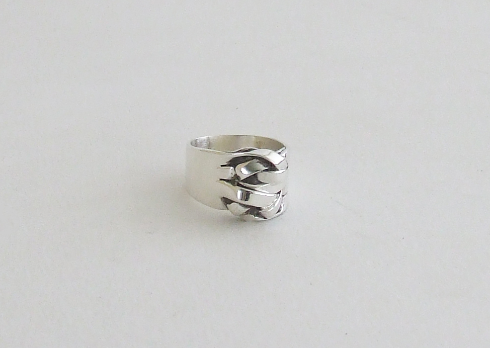 Zilveren ring waarvan de band aan twee zijden in vieren is gespleten. Bovenop de vinger zijn de uiteinden met elkaar verknoopt. In de open structuur van de knoop is heldere giethars gegoten, waarin de as is verwerkt. De onderzijde van de knoop is met zilver afgewerkt. (ontwerpopdracht S1187)